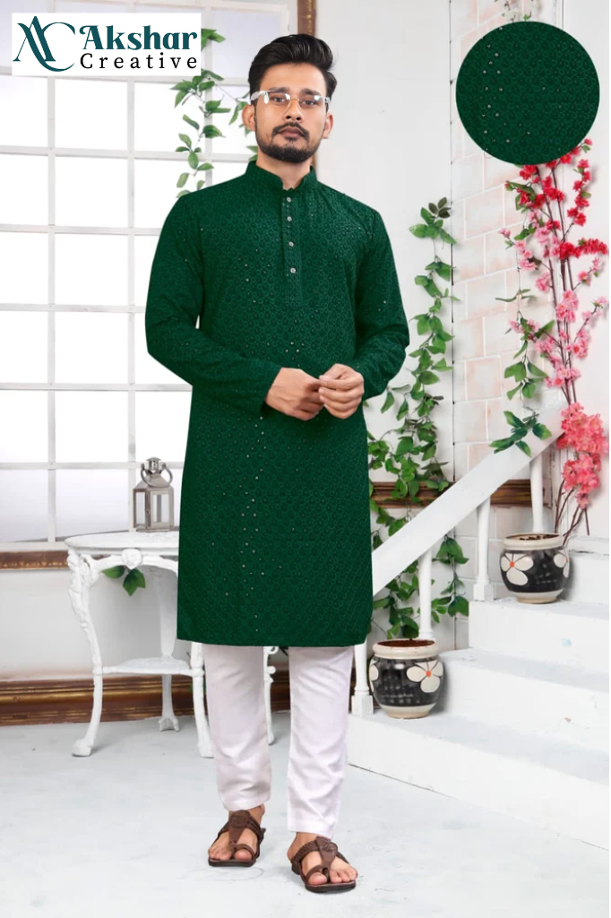 This Bottle Green chikankari kurta set is a true blend of tradition and contemporary elegance. The intricate Chikankari embroidery adds a delicate charm to the warm Green hue, creating a sophisticated yet vibrant look. For a polished finish, pair it with beige trousers or white churidar and traditional footwear like Kolhapuri Chappal, making you the center of attention at any occasion.