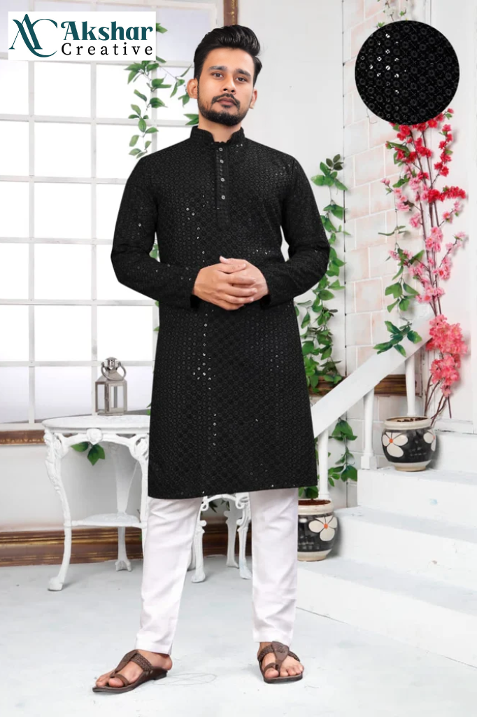 This Black chikankari kurta set is a true blend of tradition and contemporary elegance. The intricate Chikankari embroidery adds a delicate charm to the warm black hue, creating a sophisticated yet vibrant look. For a polished finish, pair it with beige trousers or white churidar and traditional footwear like kolhapuri chappal, making you the center of attention at any occasion.